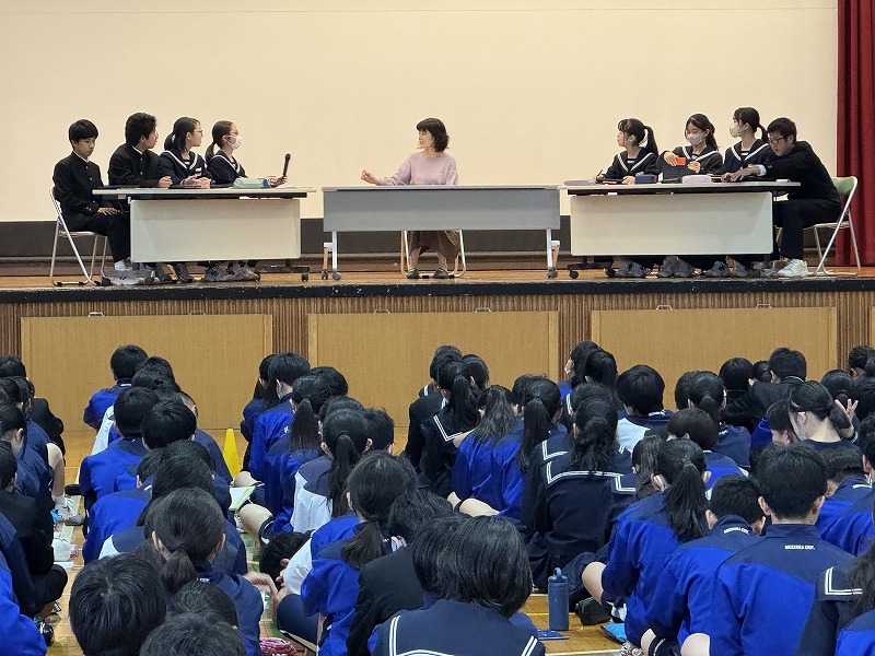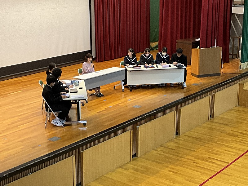 講話形式ではなく,生徒会役員が講師にインタビューをしながら進めていくという,今までにない方法にチャレンジしました。