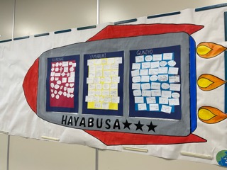 7年生のフロアをのぞくと大きな宇宙船が掲示してあります。