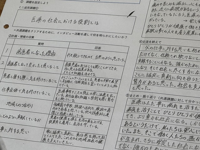 その第一歩として,身近な人の「思い」や「生き方」をインタビューをし,まとめたことを学級内で共有しました。