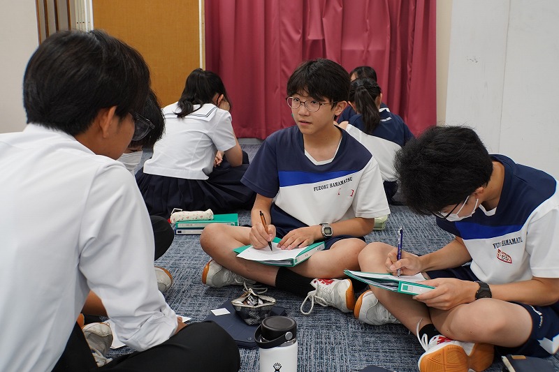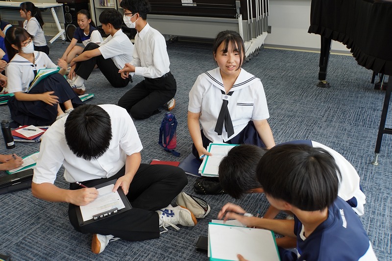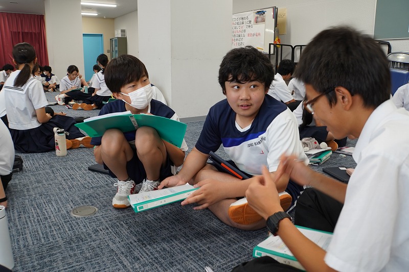 少人数のグループを作り,9年生が英語科の授業でまとめた「社会に発信したい自分の想い」を7年生に伝えました。