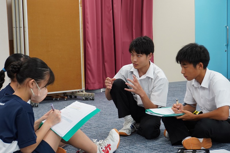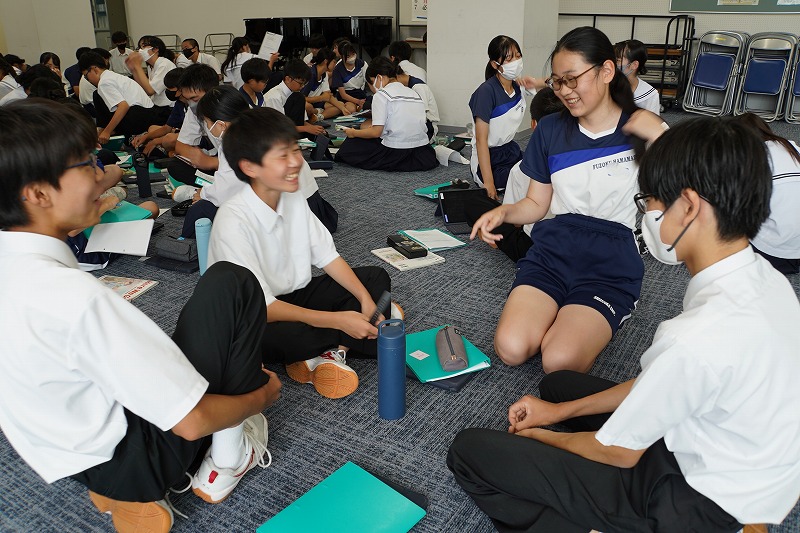 これから体育大会などでかかわる9年生の先輩について違った面から理解したり,自分の想いを英語でまとめ,ジェスチャーを交えながら発表をする9年生の姿を見て,7年生はあこがれを抱いたようです。