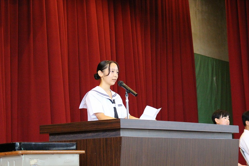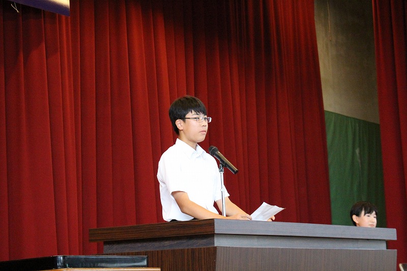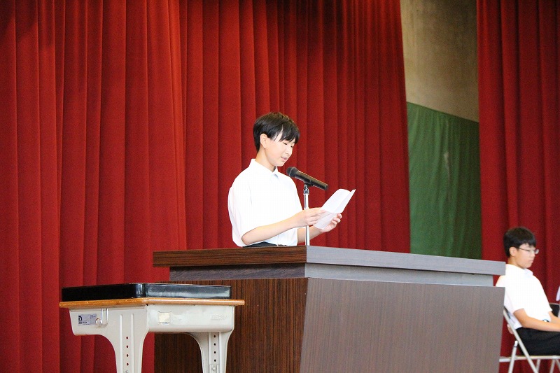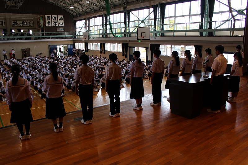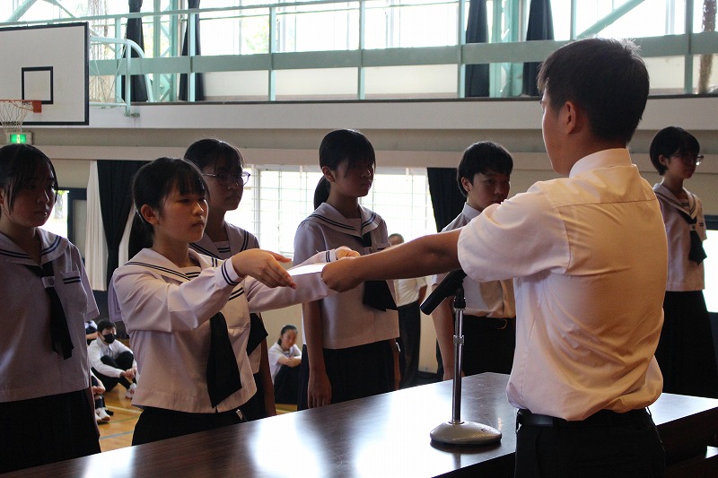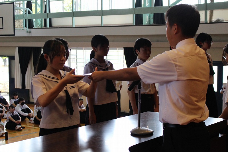 専門委員長の委嘱は,8年生の新しい生徒会長や副会長が進行,副会長の司会や補助のもと会長が委嘱状を専門委員長に渡していきました。