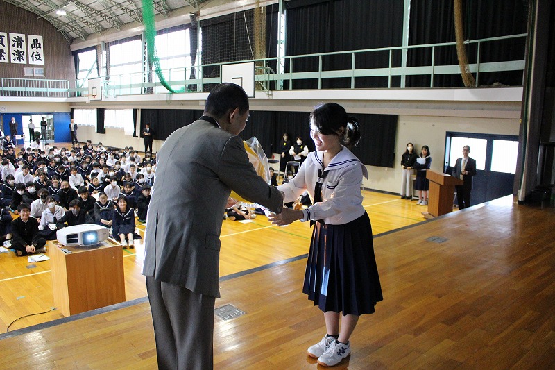 私たち9年生も浜松の企業の人と課題を見つけ,協力して計画を立てて解決策を実行して,課題解決を目指すという学習をしています。私は将来,本当にこの活動が役立つのかと疑間をもっていましたが,今日のお話しにより,この活動は社会でリーダーシップをとるための土台を作っているという考えに変わりました。