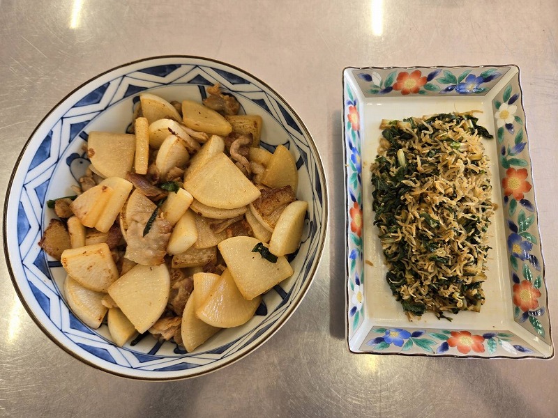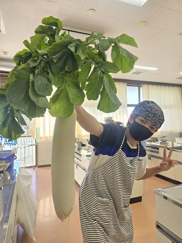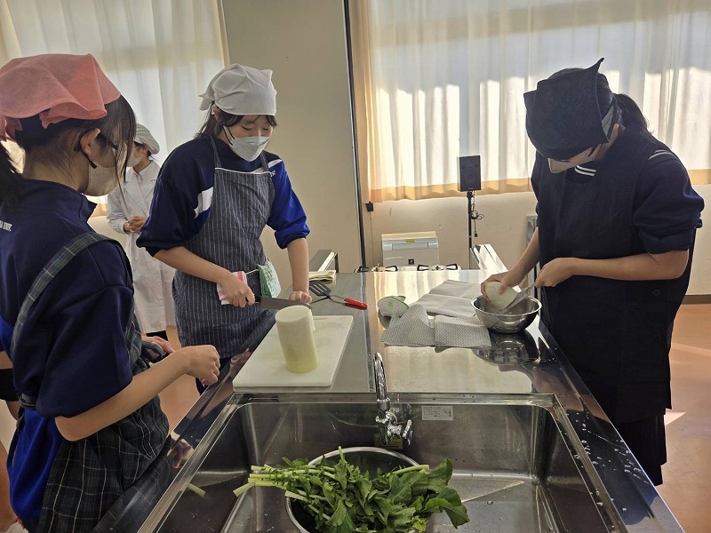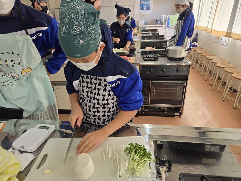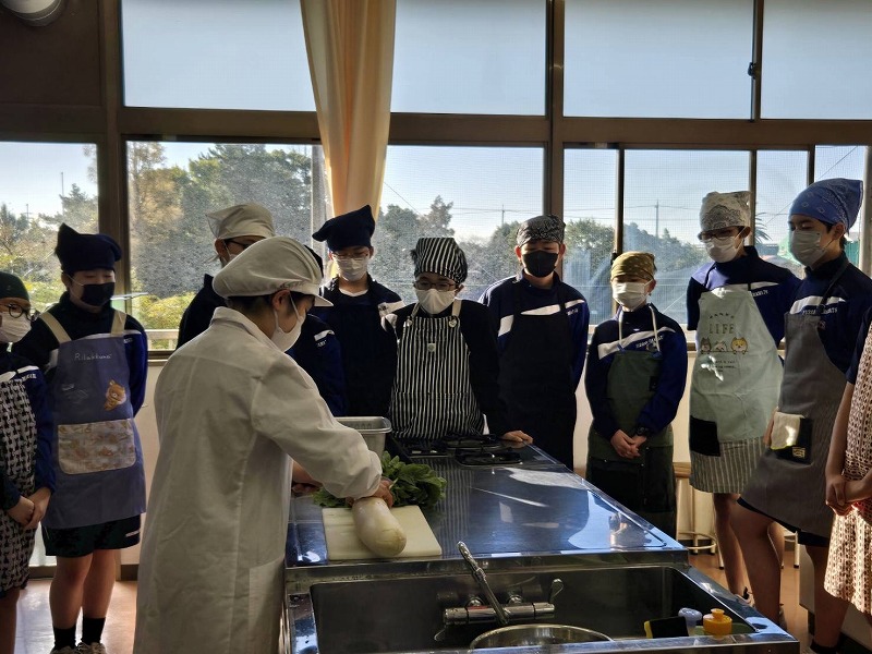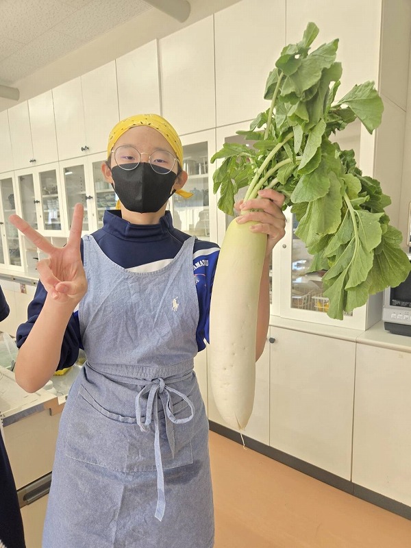 現在,家庭科の授業では,7年生は「大根の魅力を生かす」を,8年生は「日本食の魅力を伝える」ことをテーマに調理実習を行っています。