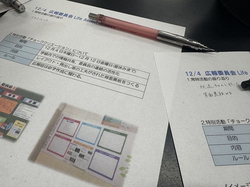 生徒会本部ではきまりについて見直したり,広報委員会では特別活動「チョーククリエーション」について確認したり,風紀委員会では「生活ガイドブック」についての振り返りをしていました。