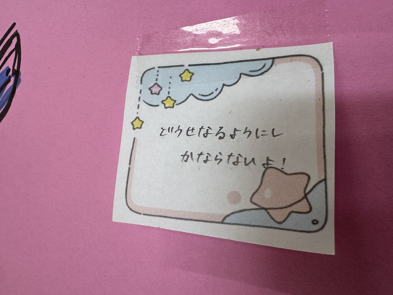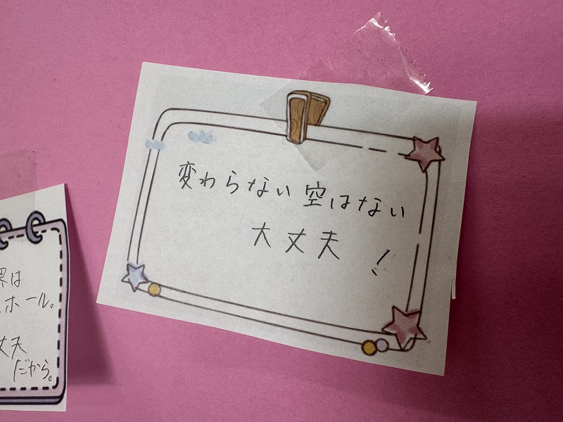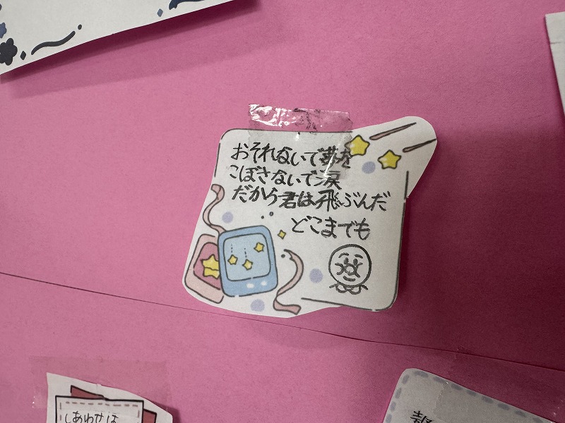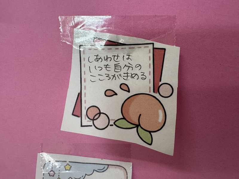 歌詞や名言など,自分が前向きになったり,友だちを元気にしたりする言葉が書かれていました。