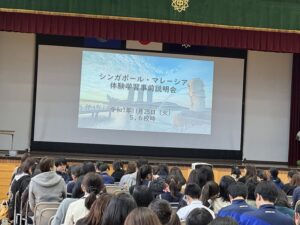 8年生は2月に,シンガポール,マレーシアを訪問し,体験学習を行う予定です。その説明会を行いました。実行委員を中心に,日程の確認や活動内容の紹介がありました。 この学習は,総合的な学習の時間(LT=Life Time)の一 […]