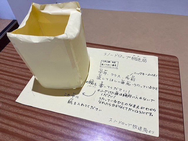5・6年生が立ち上げたプロジェクト活動「スノードロップ放送局」のメンバーが、校内放送で流してほしい音楽を募集しています。