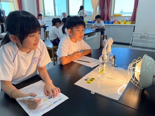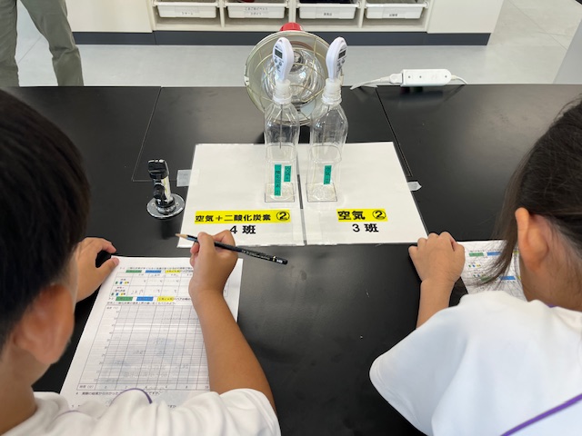地球温暖化が進む原因について講義をしていただいたあと、空気だけを入れたペットボトルと、空気と二酸化炭素を入れたペットボトルをライトで照らし、温度変化について調べる実験を行いました。子どもたちは、1分ごとにそれぞれの温度を記録していきます。すると、明らかに空気と二酸化炭素が入ったペットボトルの方が温度の上昇が早いことが分かり、子どもたちは驚きの表情を浮かべていました。