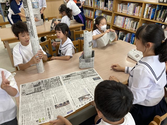 小学生と中学生が協力して,新聞を高く積んでいくの競うレクリエーションです。どのグループも,工夫を凝らして,新聞を積み上げていきました。高いタワーが立った時には,「やったぁー」という歓声が聞こえてきました。