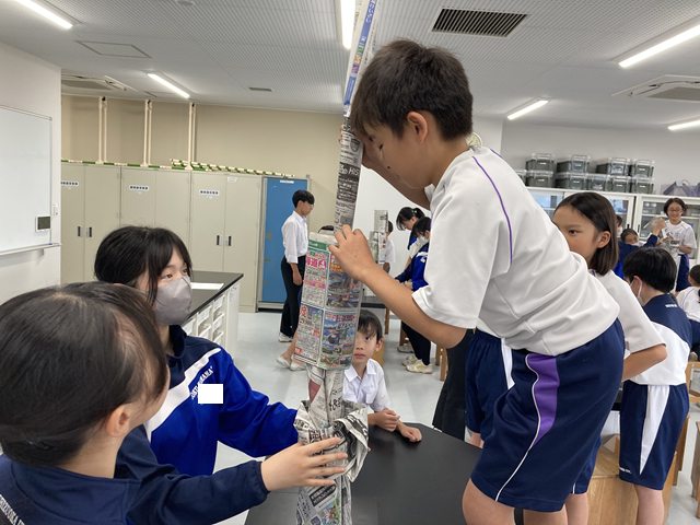 昼休みに,小中合同でふれあいタイムをしました。今年度は,中学校が中心となって,新聞タワーのレクリエーションをしました。