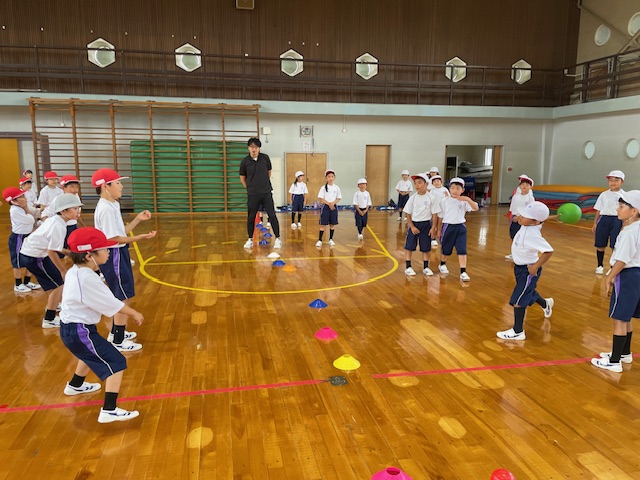 朝活動の時間を使って、低学年団の「学年団のつどい」が行われました。2年生の実行委員が中心となって計画したドッジボール大会を行いました。1,2年生のふれあい班(たてわり班)ごとにチームをつくり、ゲームをしました。