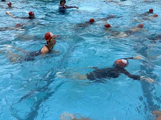 平泳ぎをしたり,背浮きをしたり,浮いている子をよけながら泳いだり,さまざまな泳法で30分間泳ぎ切りました。