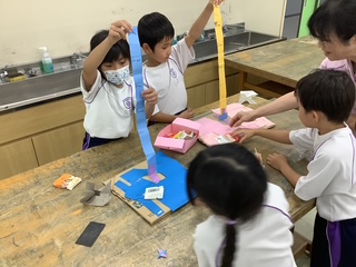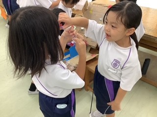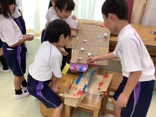 おもちゃの遊び方が分からない1年生を見つけると、2年生が優しく丁寧に教えてくれていました。1年生も「楽しかった!」「もう一回やってほしい!」と大満足。2年生が自分たちで考え、みんなにとって楽しい時間をつくり出すことができました。人と関わることの楽しさを十分に味わうことができた活動となりました。