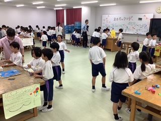 前回の2年1組に続いて、今日は、2年2組が1年2組の皆さんを招待し、おもちゃランドを開きました。2組は図工室が会場です。