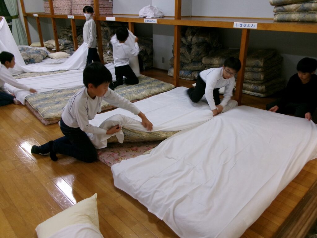 寝室は大部屋です。3・4年生で寝ます。4年生のリーダーが3年生に布団の敷き方、シーツのつけかたを教えます。協力し合い、みんなで寝床をつくることができました。それでは、お休みなさ〜い・・・