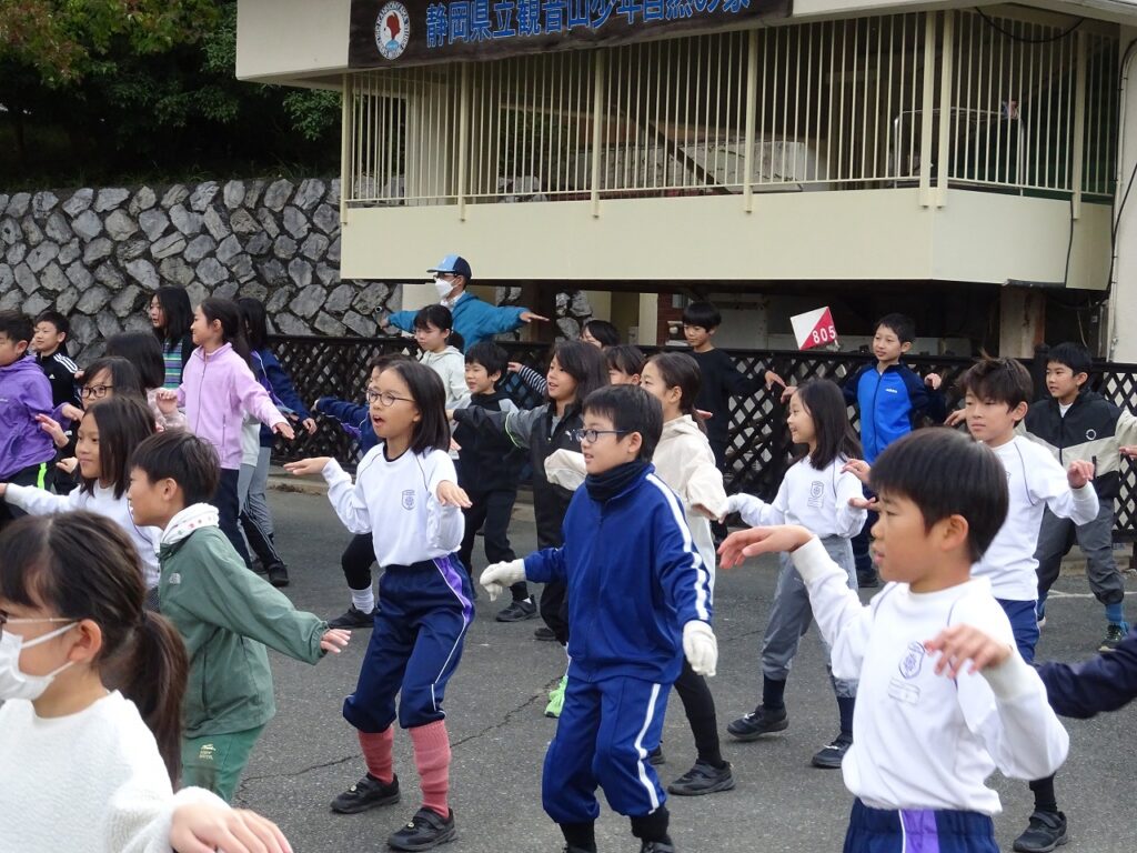 「朝のつどい」の様子です。山の中はちょっと寒いです.「きのこ体操」で体を温めます。
