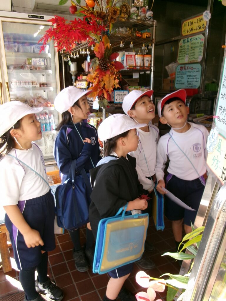 2年生の生活では、学校の周りをグループごとに探検する活動を行いました。あらかじめグループごとにコースを決めて、自分たちの計画に基づいて探検しました。保護者ボランティアの皆様や商店街の方々のご協力のもと、子どもたちは自分から挨拶をしたり、知りたいことを質問したりすることができました。