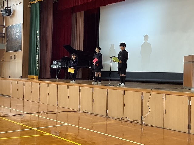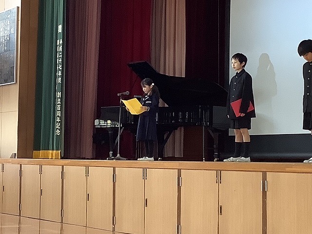式の初めに、3人の代表児童が「2学期にがんばったこと」の発表をしました。日々の学校生活を通して、自分が考えるウェルビーイングに向かって積み重ねた努力やその振り返り、そしてこれからの新たな目標について生き生きとスピーチすることができていました。有意義な2学期を過ごすことができたことが伝わり、うれしく思います。