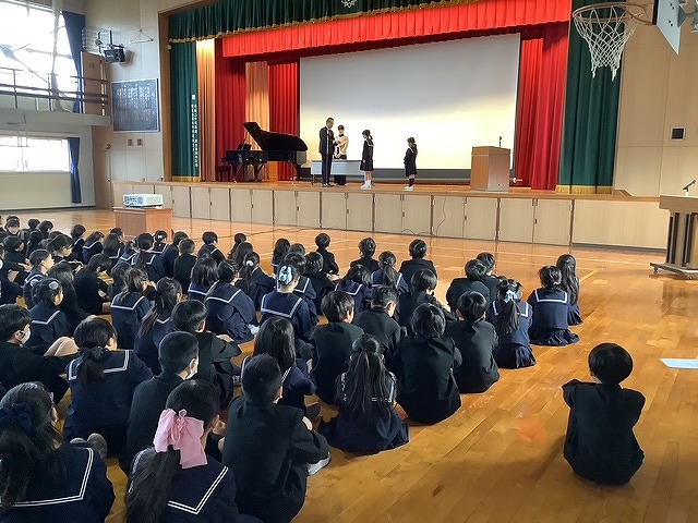 体育館に入場するとき、一番初めに入場した6年生が、規律正しく、よい姿勢で静かに待つことができたので、後から入場する下級生たちは、6年生がつくり出す、静かで落ち着いた態度を手本として、全員で儀礼的行事にふさわしい雰囲気をつくることができました。