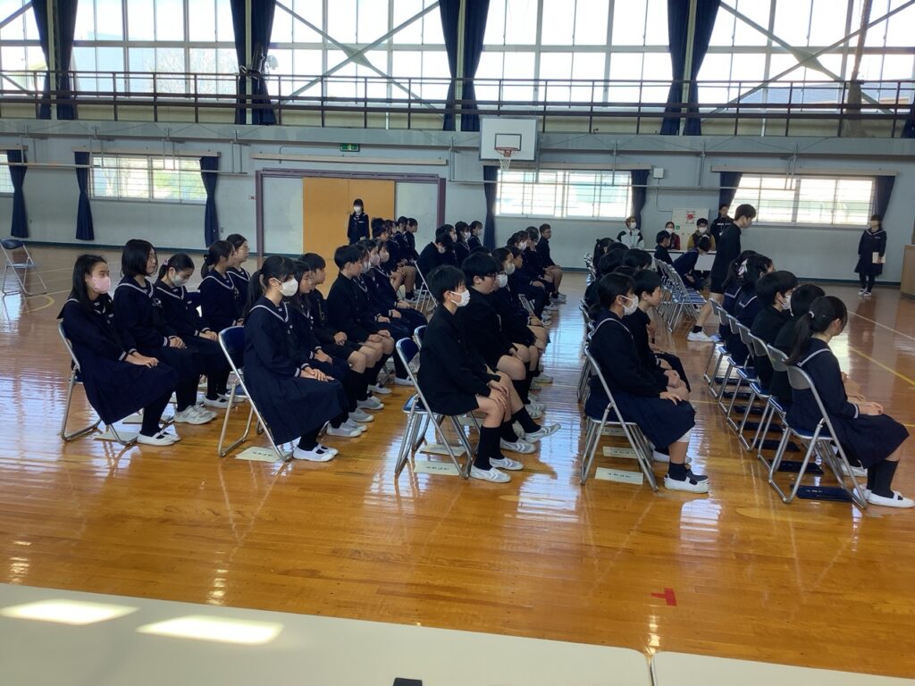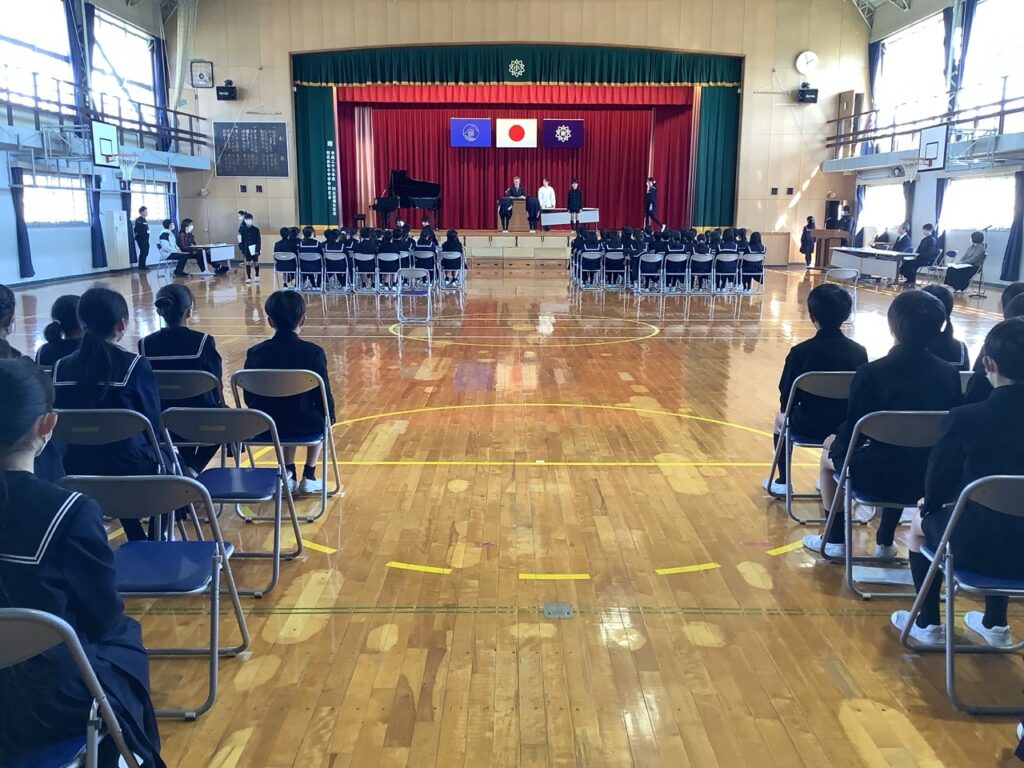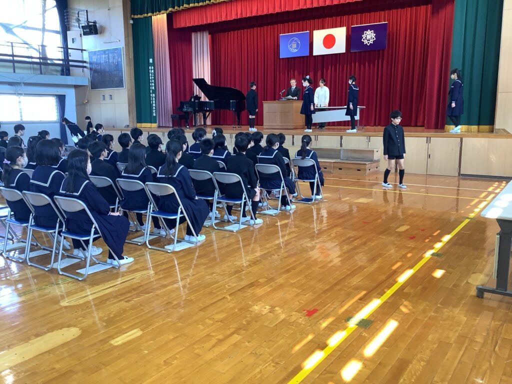 本番と同じ流れで、入場から証書授与、別れの言葉、退場まで一通り確認しました。
