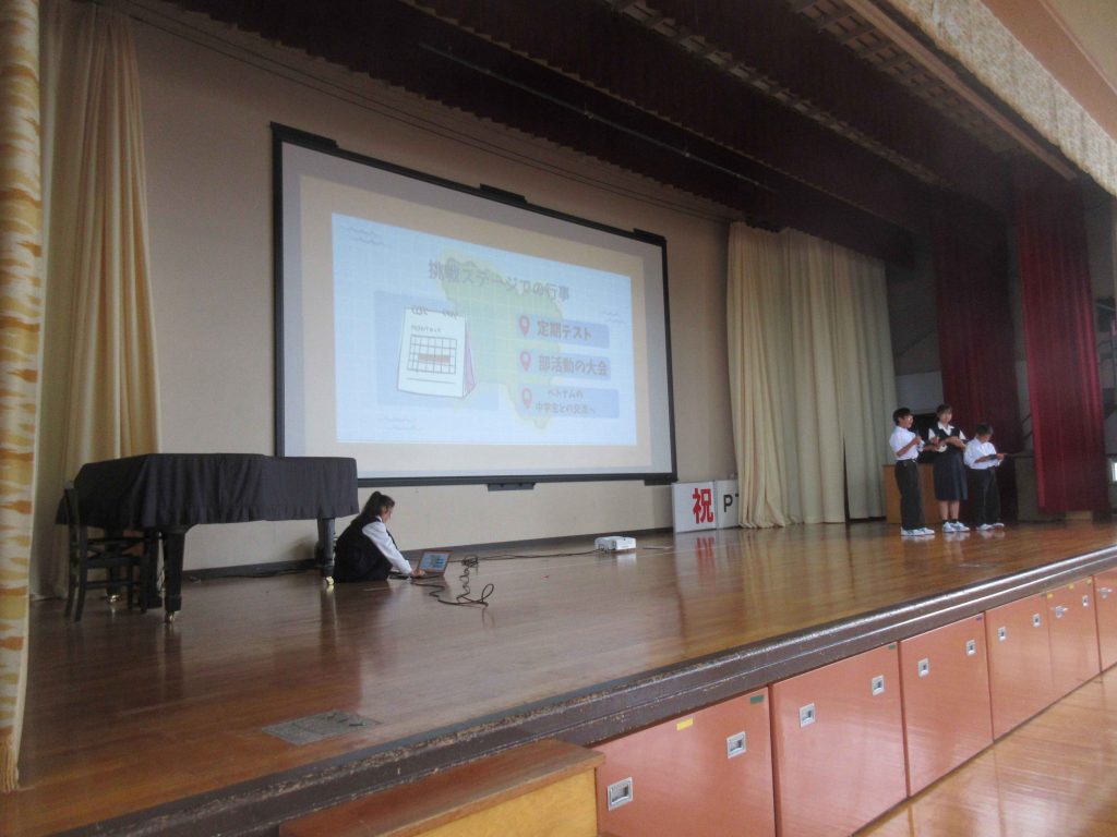 4月からゆう陸までの「創造のステージ」が終わると、次は「挑戦のステージ」が始まります。挑戦のステージ集会では、学年総務を中心に各学年で4月からの振り返りと、今後の取組について全校の前で発表しました。