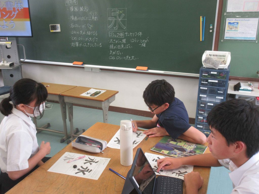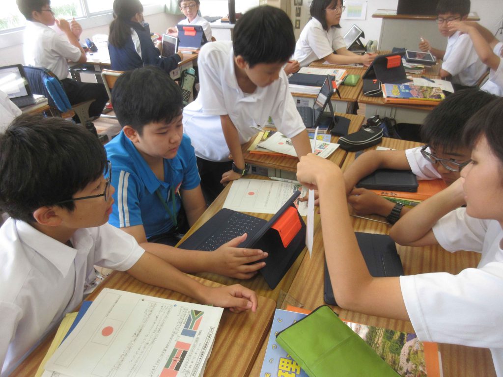 英語の授業では、留学生を相手に質問したり、確認したりして、しっかりとお互いの「やりとり」を行うことができていました。国語の授業では、プレゼンの様子を真剣に聞く留学生の姿が見られました。社会の授業では、自分の考えを書いてお互いに説明する活動が行われました。理科の授業では、協力して実験を行い、結果を記録する姿が見られました。数学の授業では、留学生が中心となって、小集団追究をしている場面もありました。