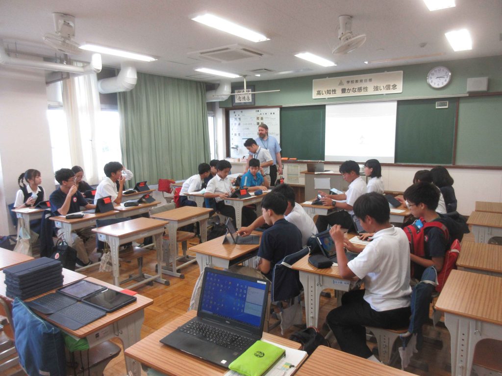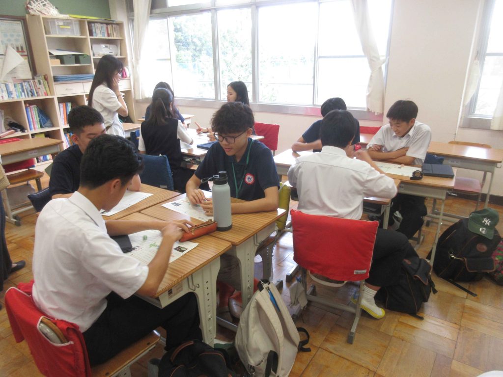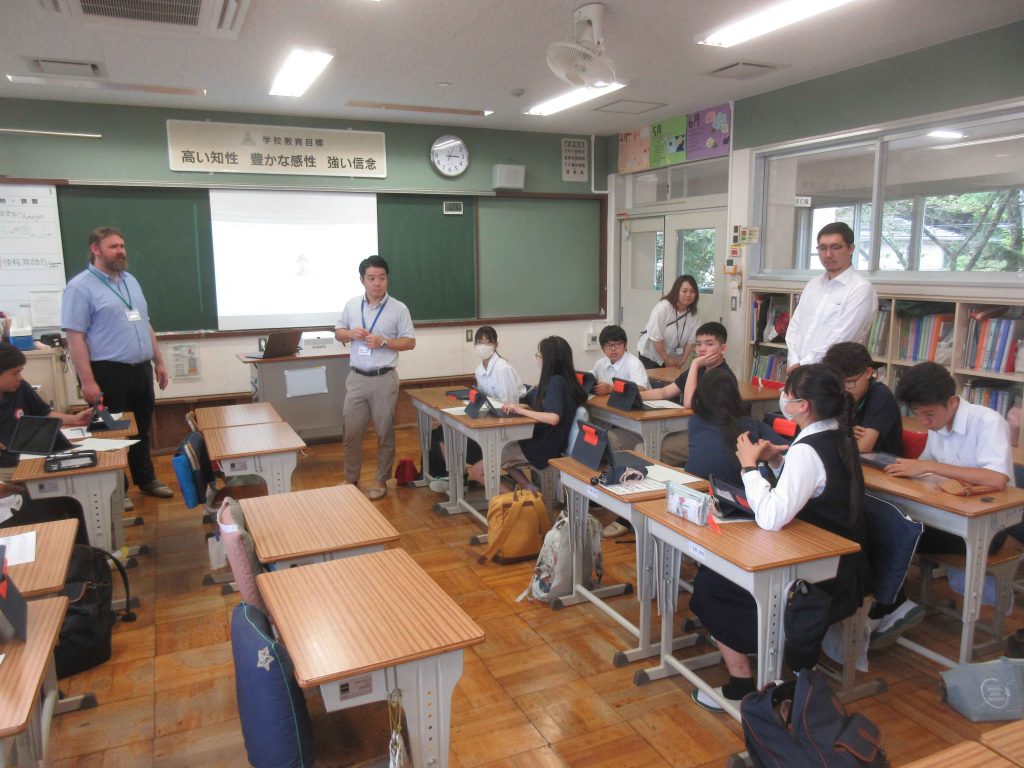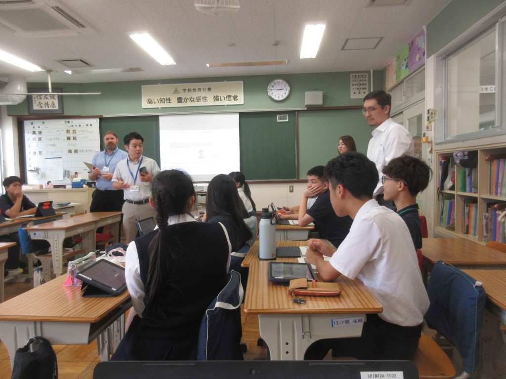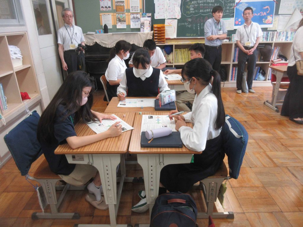 オールイングリッシュで進む授業に戸惑いながらも、ベトナムの留学生たちは英語に慣れており、スムーズに課題に取り組んでいる様子が見られました。また共有の場面でも、しっかりと自分の考えを伝えているのが印象的でした。数学の授業では実験を行い、お互いに情報交換しながら、結果を共有していくという流れで、附属島田中の授業スタイルに似ている部分も多くありました。