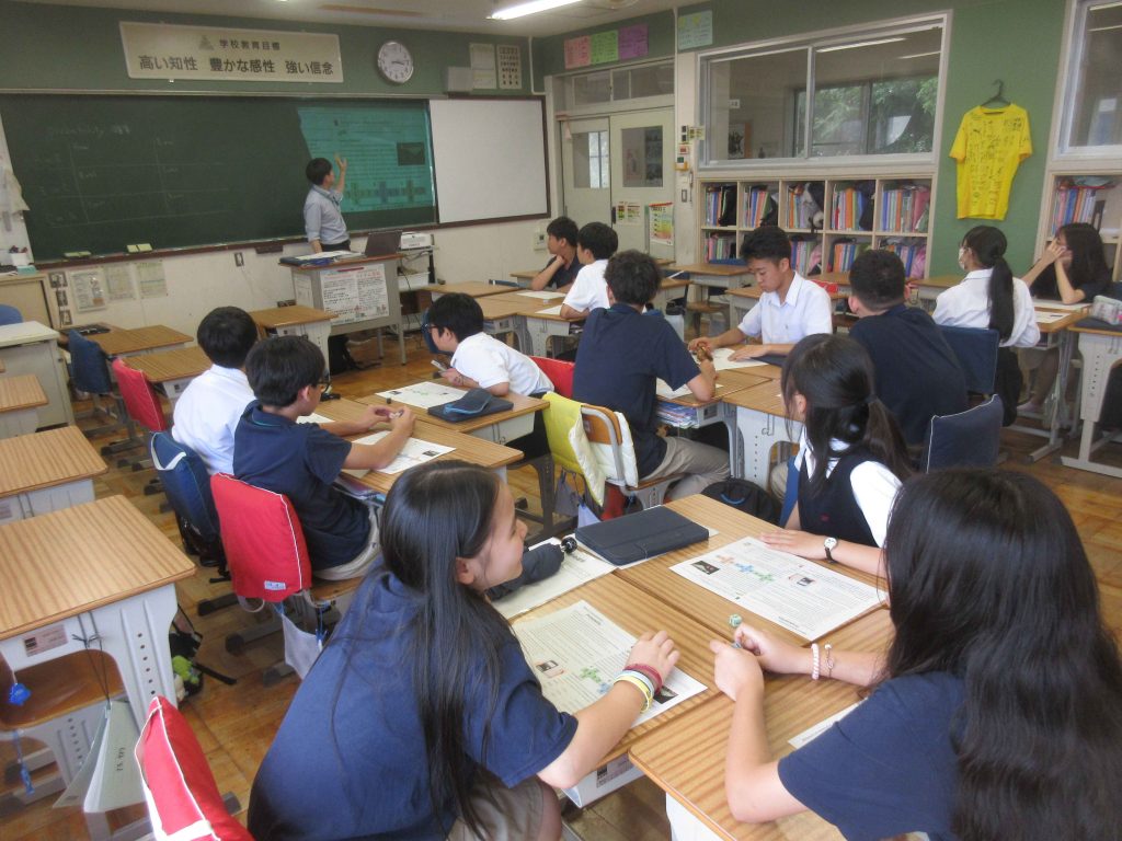 ふじのくに国際高校のIB(国際バカロレア)のプログラムの出前授業が実施されました。昨年度は附属島田中の3年生を対象に実施してもらいましたが、今回はベトナムプロジェクトの一環として、留学生とホストファミリーの生徒、また興味を持って参加した生徒を対象に英語と数学の授業が行われました。