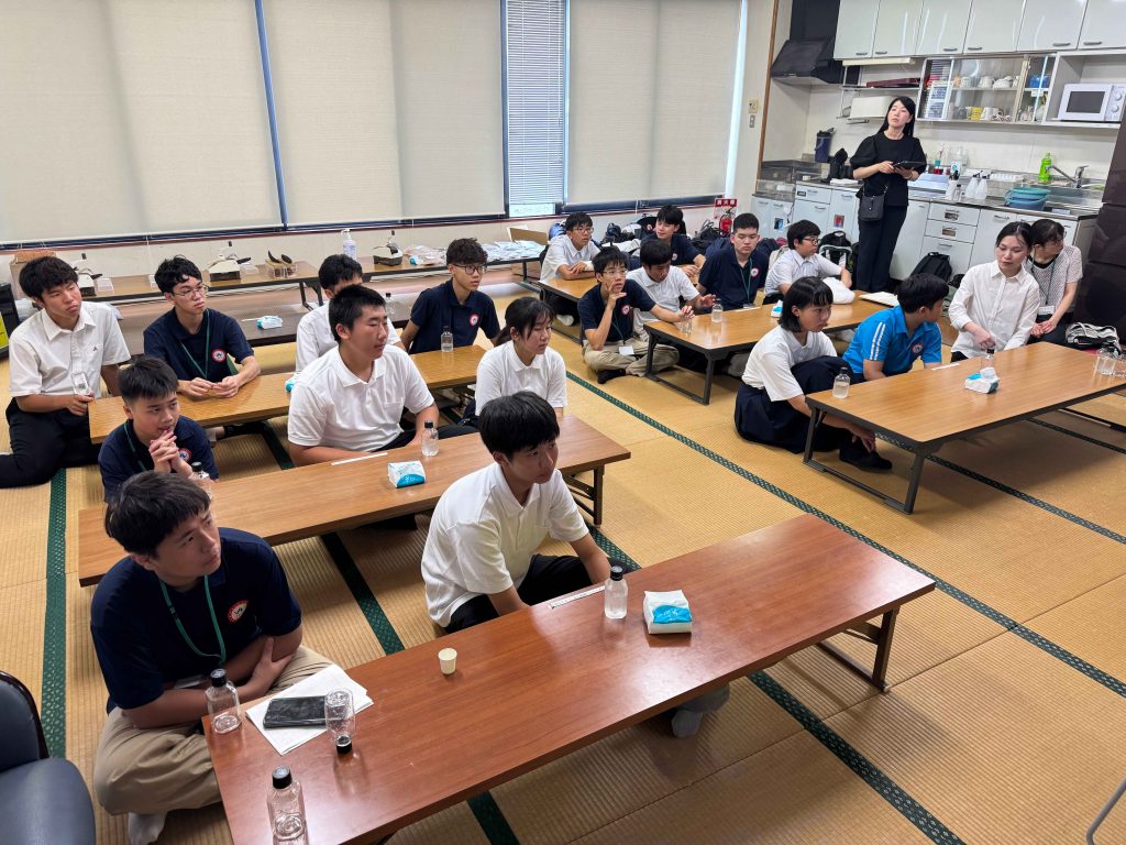 その後の、「鰹節削り体験」や「だしの試飲」では、今まで削ったことのない鰹節削りに夢中になっていたり、だしについて感想を伝え合ったりしていました。自分で削った鰹節を嬉しそうに試食している様子も見られました。留学生にとっても附属島田中生にとっても貴重な時間になりました。