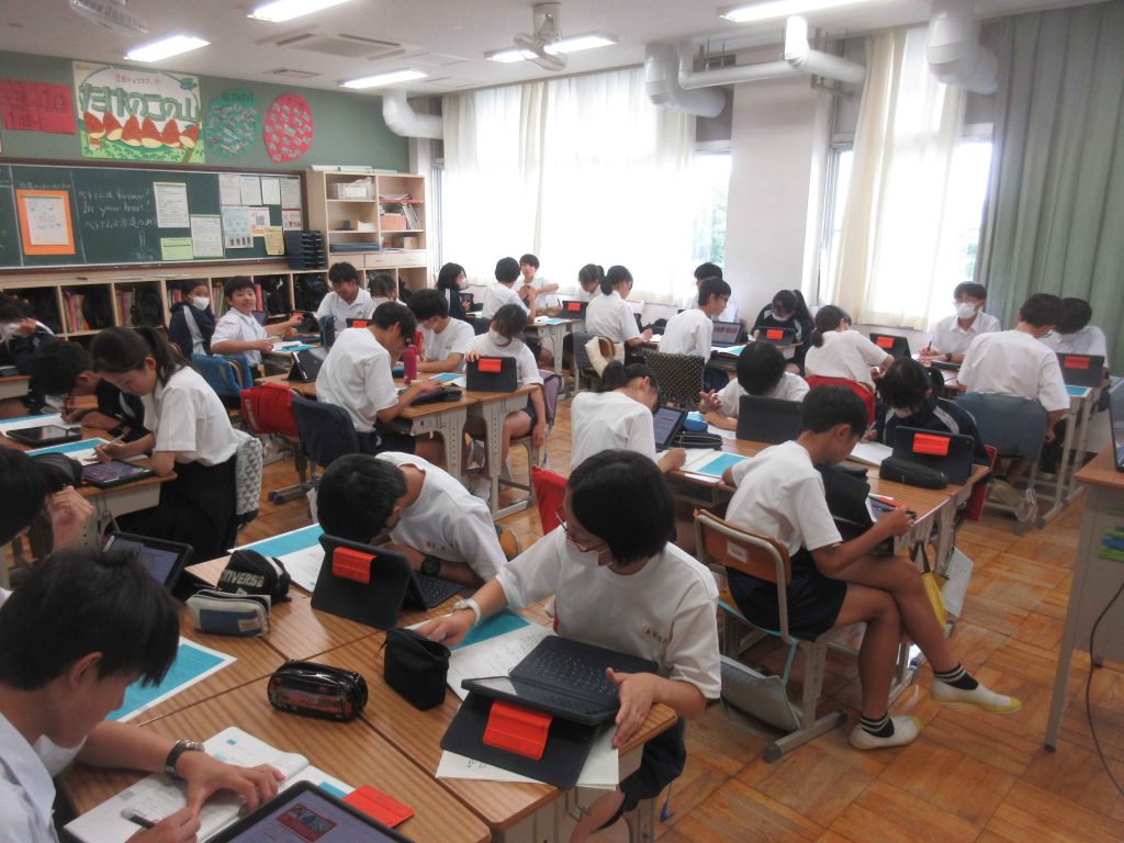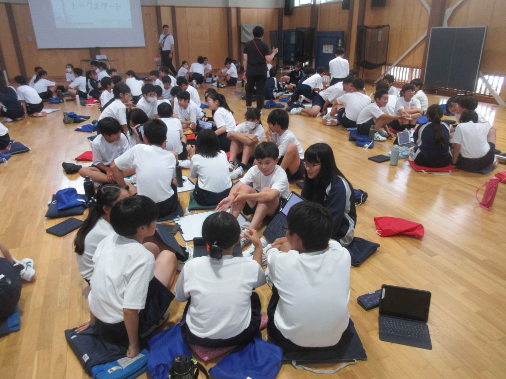 1学期の終業式が目前となり、各学年でしめくくりの会が行われています。3年生は学年集会で、夏休みの過ごし方について考えていました。受検生としての夏休みを迎えるにあたって、心構えをしっかりと持つ会だったと思います。2年生は、新しい総合学習でキャリアのことについて考えていました。夏休みには、高校調べも行う予定です。1年生は、集会でフリートークを行い、1学期を振り返っていました。キーワードをもとに楽しそうに振り返っていました。