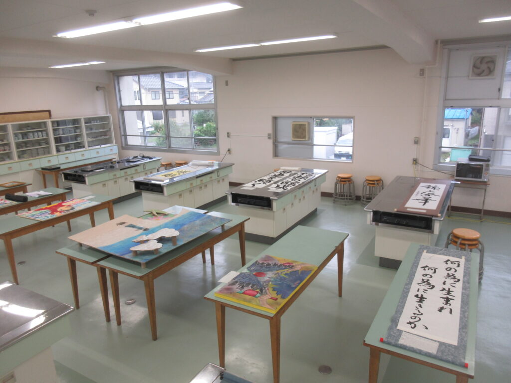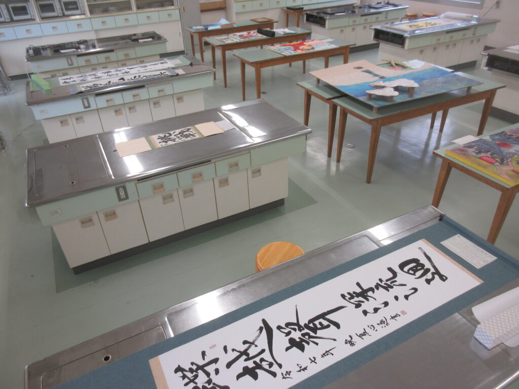 ゆうかり祭文化部門の展示の部の事前展示が調理室で行われています。当日は、焼津文化センターのホワイエに作品が展示されます。書道、絵、イラスト、動画などの作品が数多く出品されています。どの作品も附属島田中生の個性があふれるものです。