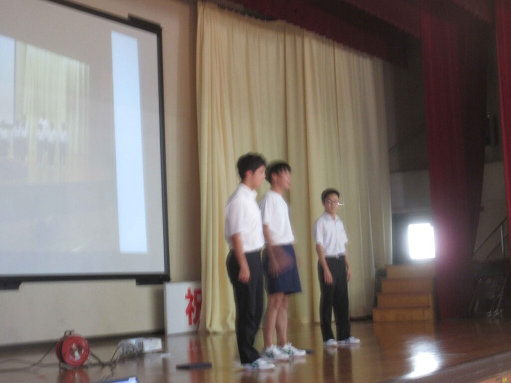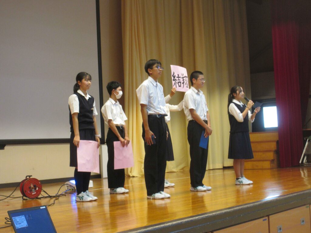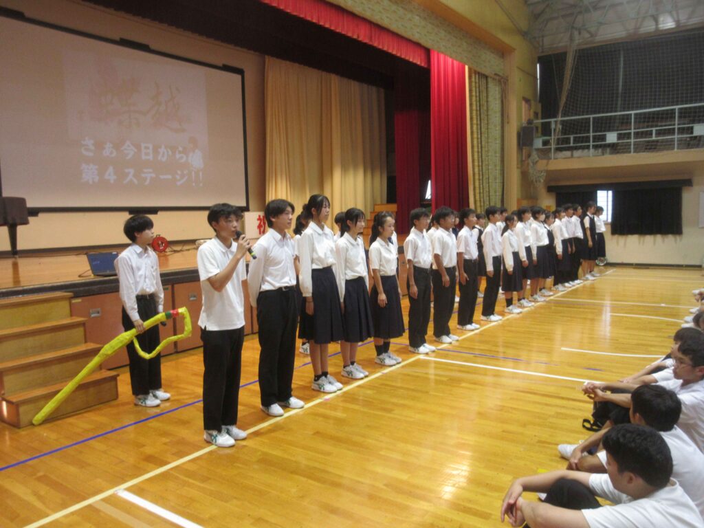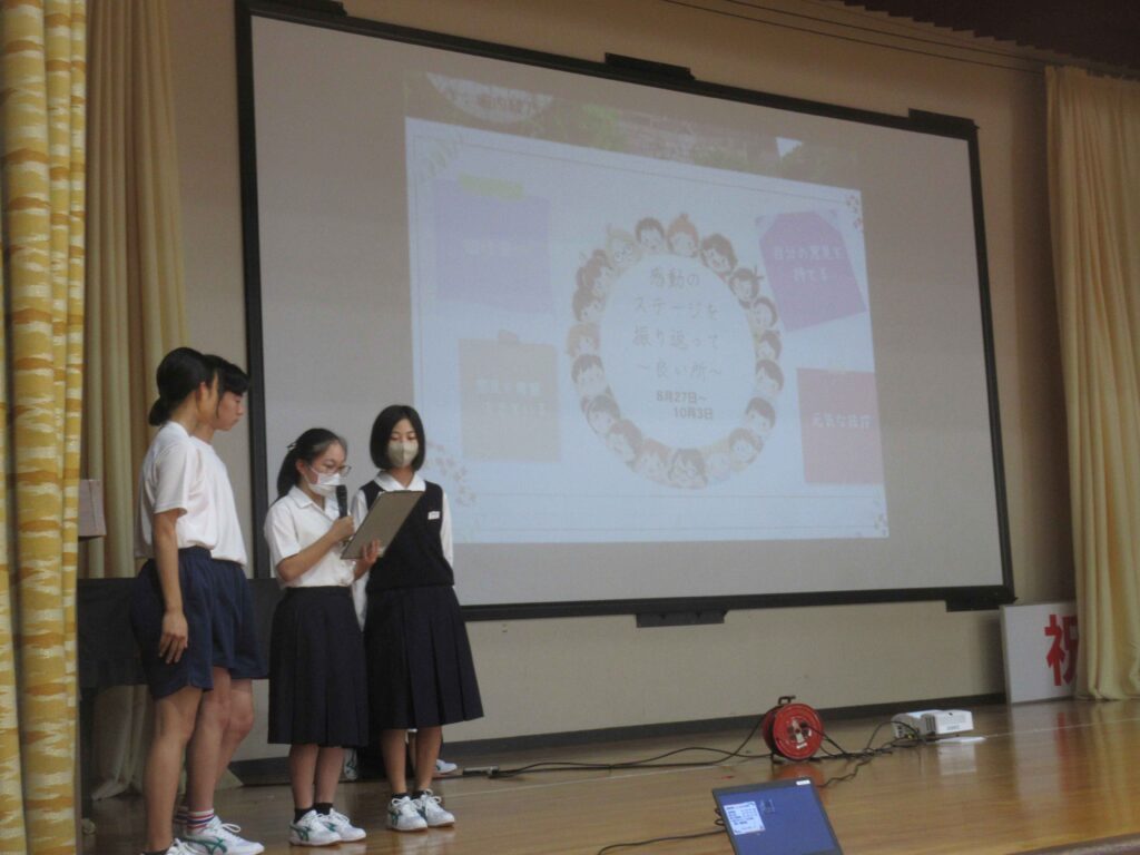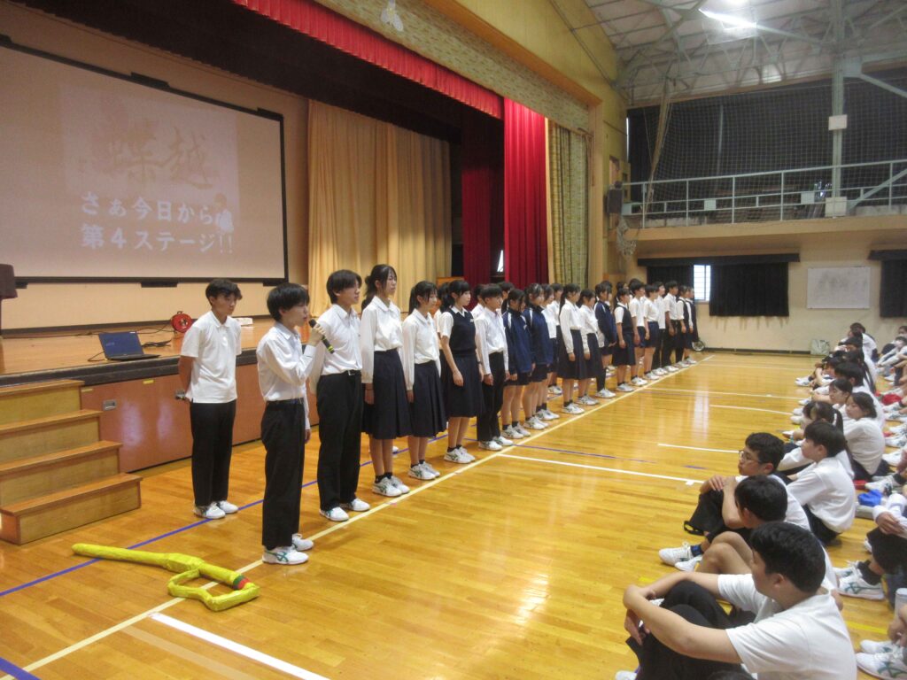 「感動」の第3ステージが終わり、「充実」の第4ステージが10月6日(月)から始まりました。そこで全校集会を実施し、各学年の学年総務から、第3ステージを振り返り、第4ステージの目標を全校に伝えました。