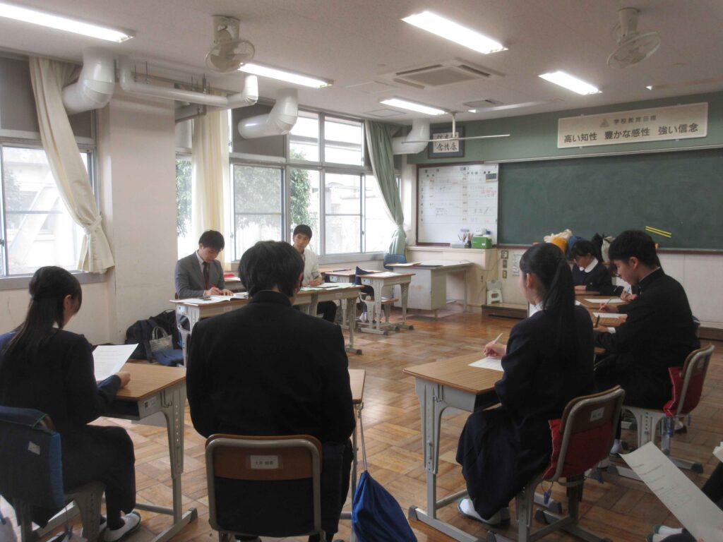 3年生の一斉面接指導がありました。入試に向けて、12月から取り組んできた成果を出す場でした。学校にいる先生方が面接官となって、3年生に面接の作法や身だしなみ、受け答えの内容などを指導しました。面接会場からは緊張感が漂い、自分なりの言葉で面接官の質問に一生懸命答えている姿が多く見られました。