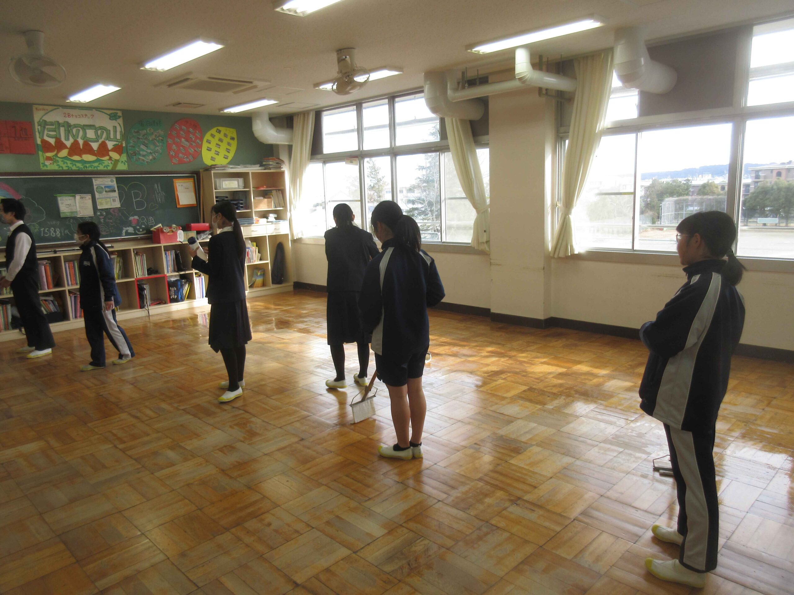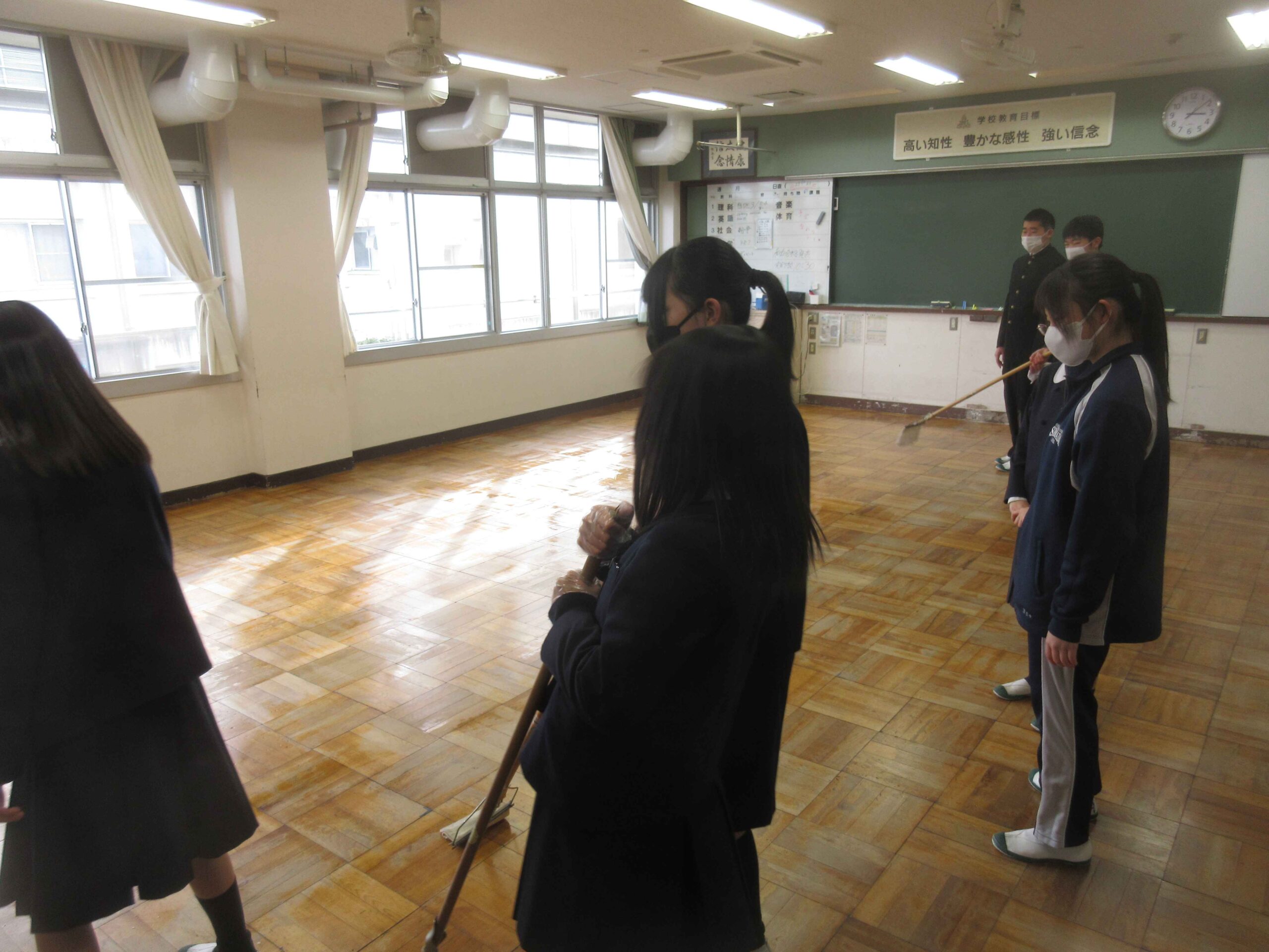 年度末のワックスがけが行われました。附属島田中のワックスがけは、環境委員が中心となり、各クラスで募ったボランティアが行います。毎回、各クラスで多くの人が自主的に「ワックスがけ」のお手伝いに参加してくれます。そういう場面でも「主体的」な様子が伺えます。