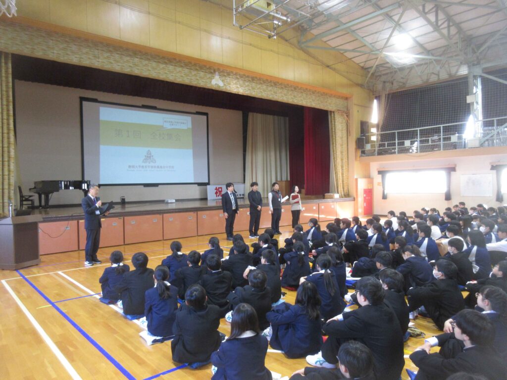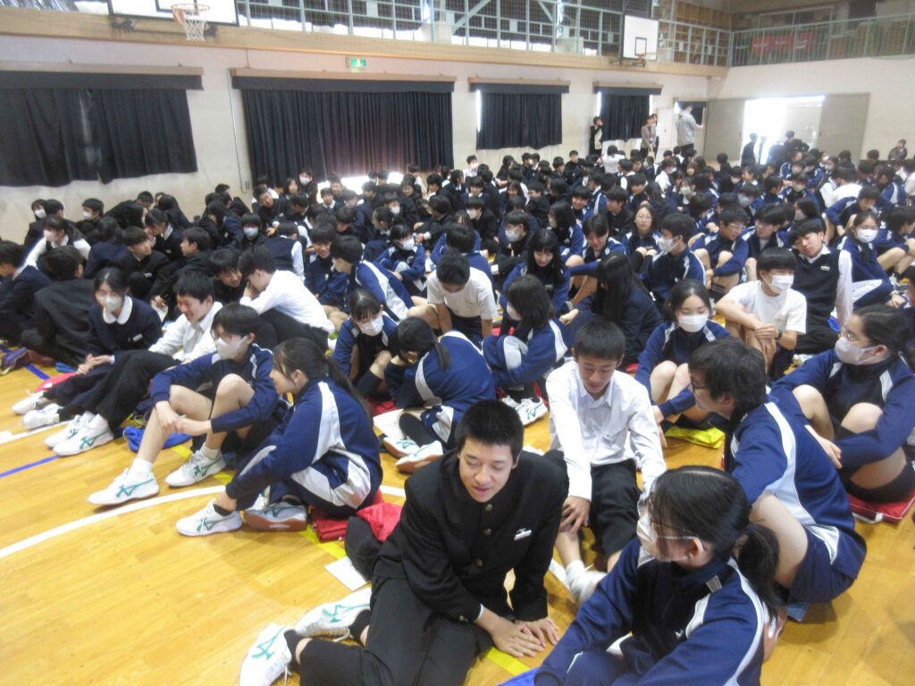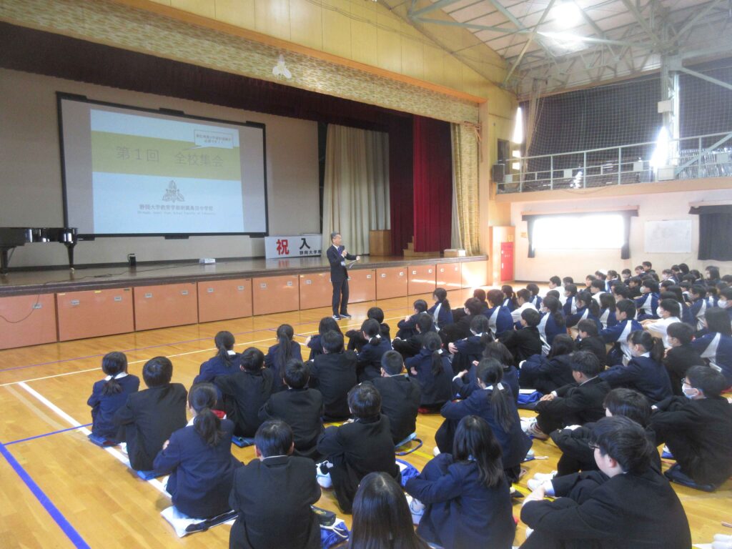 3学年が集まる最初の全校集会が実施されました。校長先生からは「全校合わせると74校の小学校から附属島田中学校には入学してきています。74通りの経験を生かしていってほしいです」といった話があり、聞いていた生徒も驚くと同時、自分の個性を発揮していく決意が見られました。