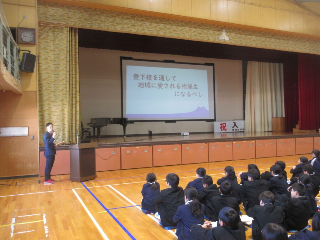 またそれぞれの担当の先生から、「防犯、防災について」「附属島田中学校での生活について」「ICT関係」「交通ルール」等、これからの学校生活をスタートしていく上で、3学年ともに共有、確認しておきたい話がありました。