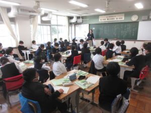 学級組織が決まった後、次は学級の方向性が話し合われ「学級目標づくり」が行われました。学級目標は、この1年で色々な場面で目指す姿を表すだけでなく、自分たちを評価し振り返るものになります。