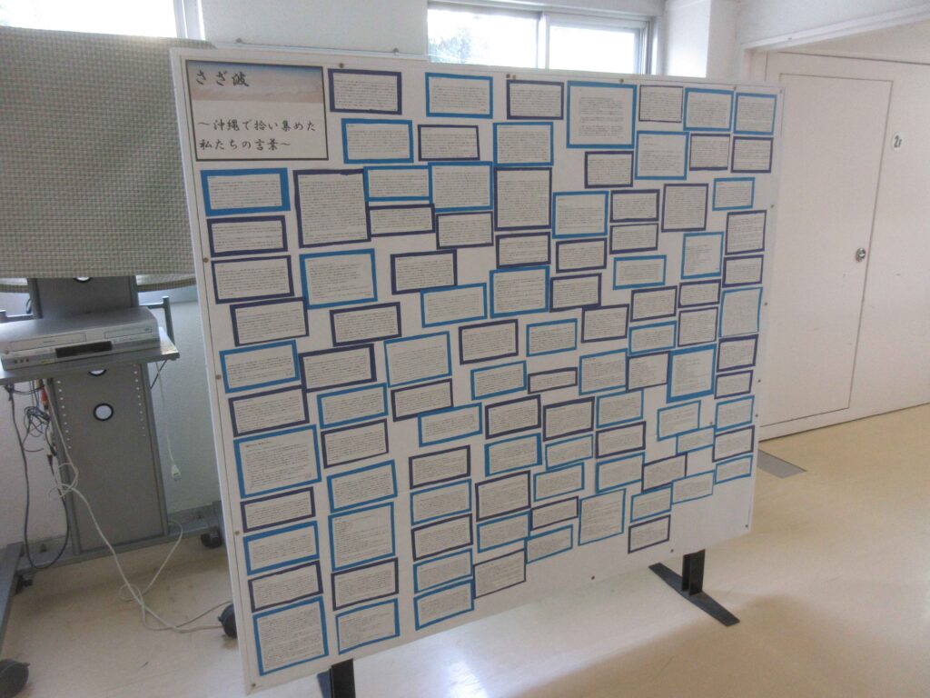 沖縄での修学旅行で感じた「平和」について、国語の授業でふりかえりが行われました。実際に現地へ行って感じたこと、考えたことを、しっかりと文章に表していて、どのふりかえりも「想い」が伝わってきます。ボードに掲示され、階段を上がっていく2年生や通りがかった1年生も立ち止まって読んでいる姿が見られます。こうしたことも、「次の修学旅行」や「平和学習」につながっていきます。