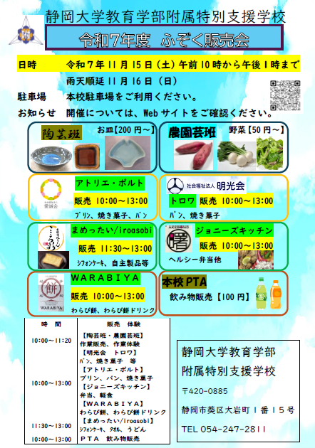 11月15日(土)にふぞく販売会を開催します! 2025年10月28日 最終更新日時 : 2025年10月28日 tokushi 当日は高等部の作業製品と事業所製品の販売があります。ぜひご来校ください! 日 時:11月15日(土) 午前10時から午後1時まで販売 ※雨天順延11月16日(日) 場 所:本校 ゆうゆう館前、ゆうゆう館